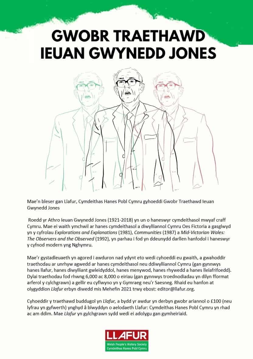 Mae’n bleser gan Llafur, Cymdeithas Hanes Pobl Cymru gyhoeddi Gwobr Traethawd Ieuan Gwynedd Jones